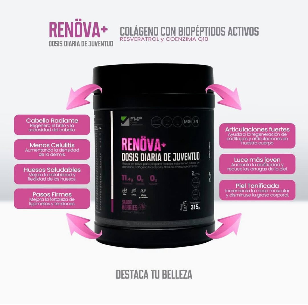 Gracias a su fuente de colágeno hidrolizado con biopéptidos activos, beneficia tu piel, uñas y cabello; fortalecido con Resveratrol como potente antioxidante que combate el estrés oxidativo, contribuyendo a la longevidad celular; y potenciado con Coenzima Q10 como antioxidante que contribuye a la regeneración celular. Fortalecido con Zinc y Magnesio, te ayudará a mejorar tu sistema inmunológico y fortalecer los huesos con cada toma.